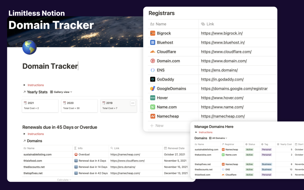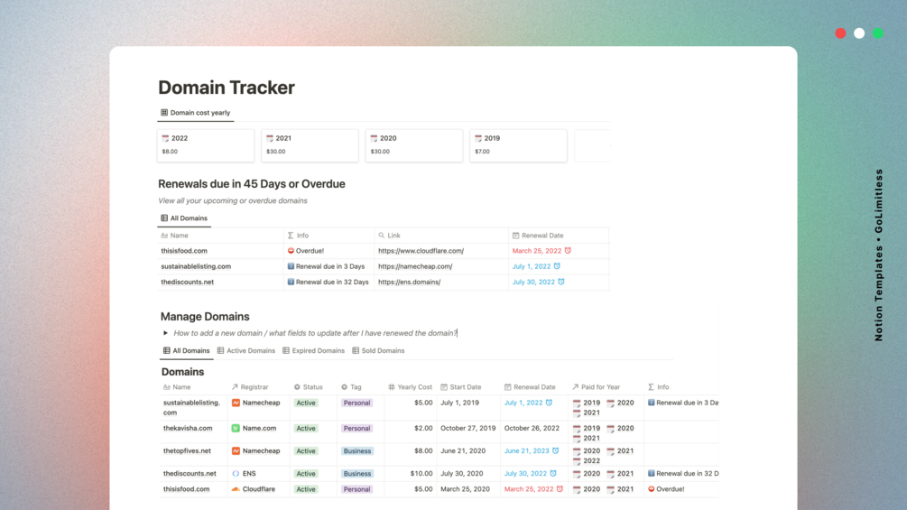 Minimal template to track all your domains in a single place. Get yearly money spent and manage renewals.