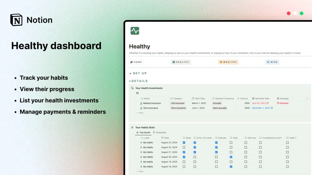 Healthy, Wealthy & Wise - Notion Dashboard