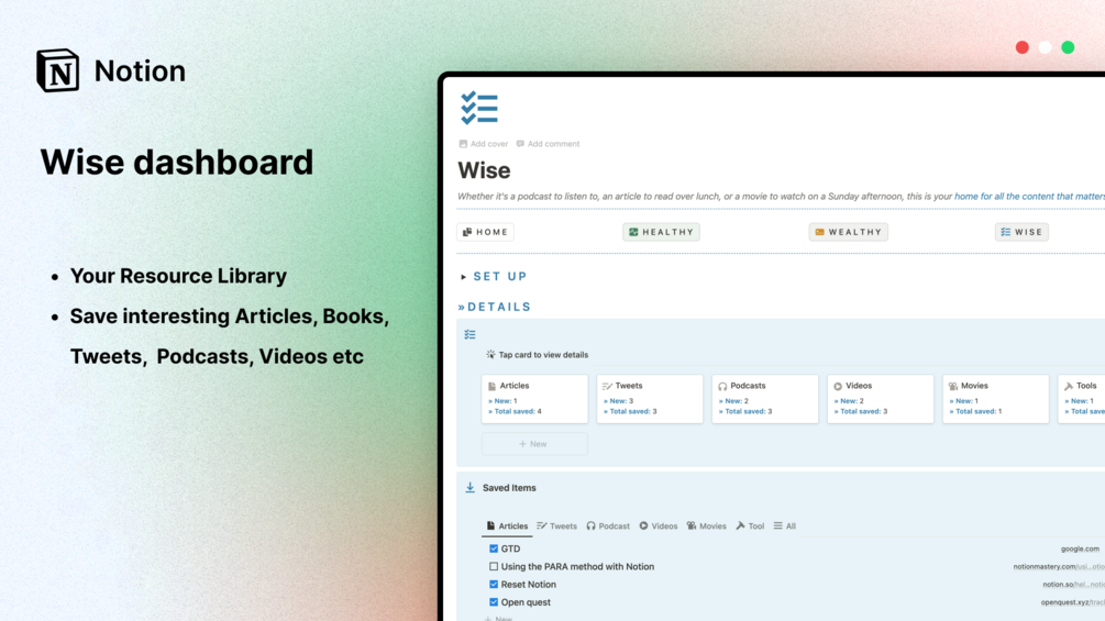- Wise Dashboard: Capture and organize your favorite articles, books, tweets, videos, and podcasts.