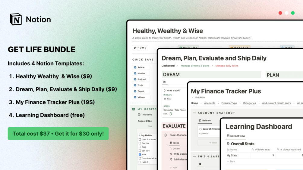 Get our Notion Life Bundle, featuring 4 of our most popular templates:
