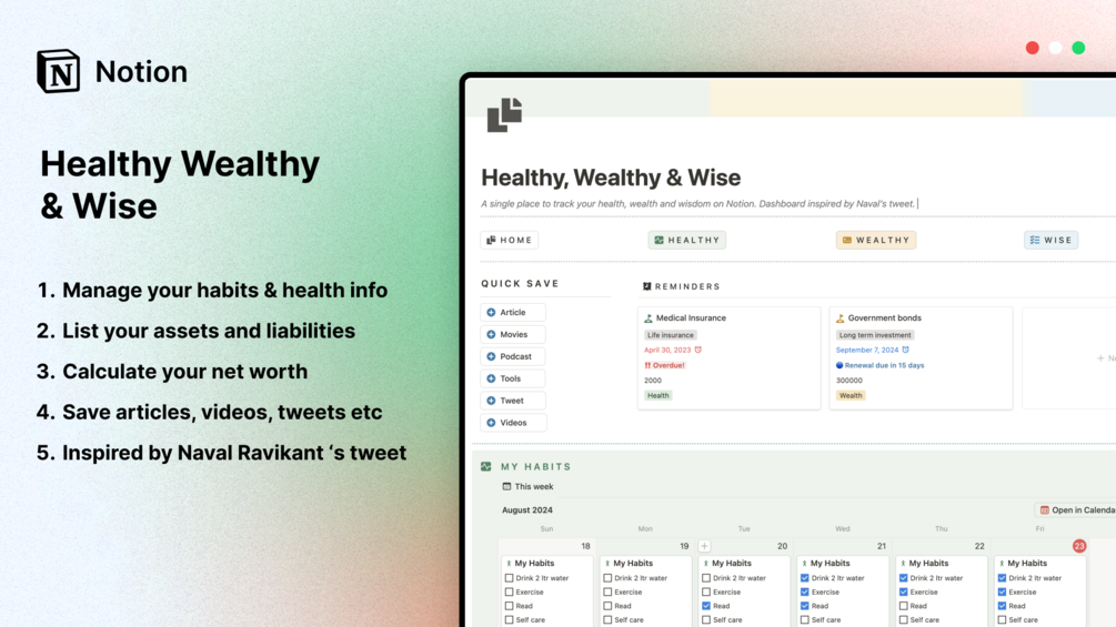 Track your health, manage your wealth, and curate your wisdom—all within this powerful all-in-one Notion template.