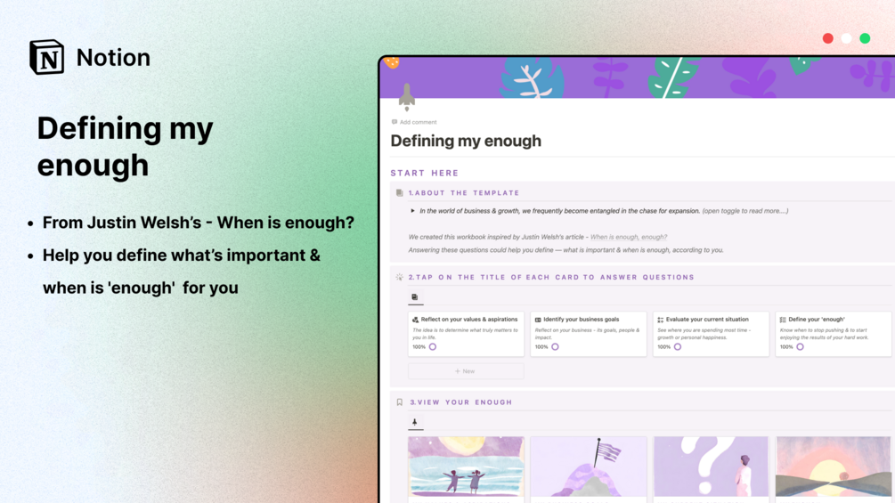 - Defining My Enough: Find out what truly matters with a workbook inspired by Justin Welsh.