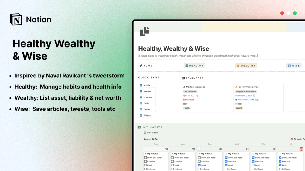 - Healthy, Wealthy & Wise: Track your health, wealth, and wisdom, inspired by Naval Ravikant.