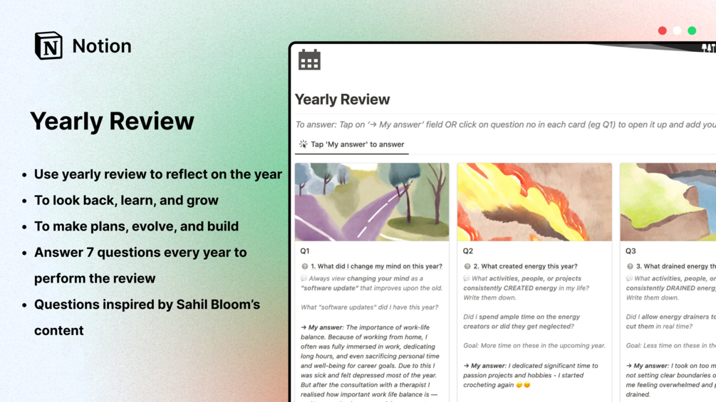 ✨ Yearly Reviews: Reflect on your entire year with 7 thoughtful questions inspired by Sahil Bloom’s tweet.