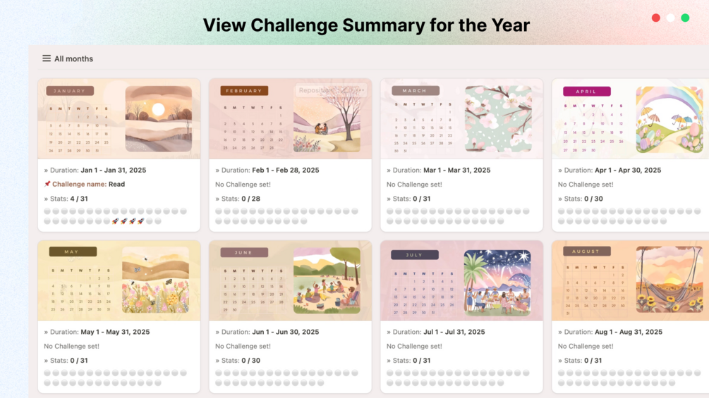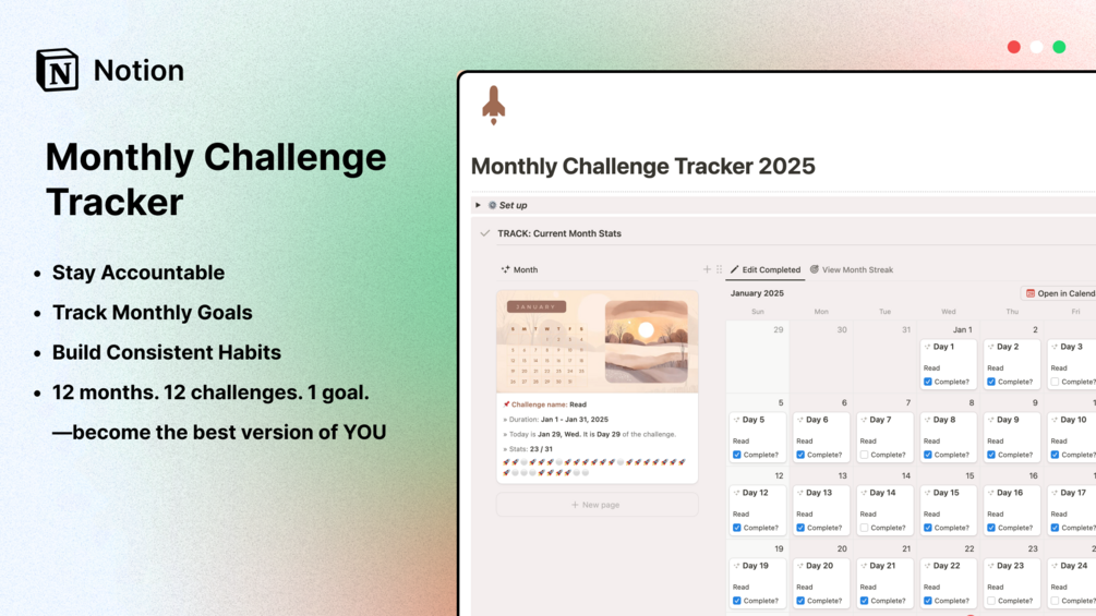 Get a pre-filled Notion tracker with months & dates for 2025 set—just enter your challenge and track daily! 🚀