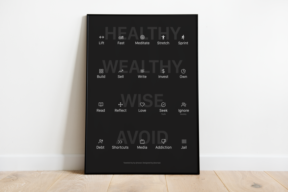 Big fan of Naval on Twitter. Love the conciseness of his tweets and the choice of words. Those tiny sentences pack a lot of clarity and meaning. This artwork is a visual / minimal representation of one of his recent tweetstorms on being Healthy, Wealthy & Wise.
