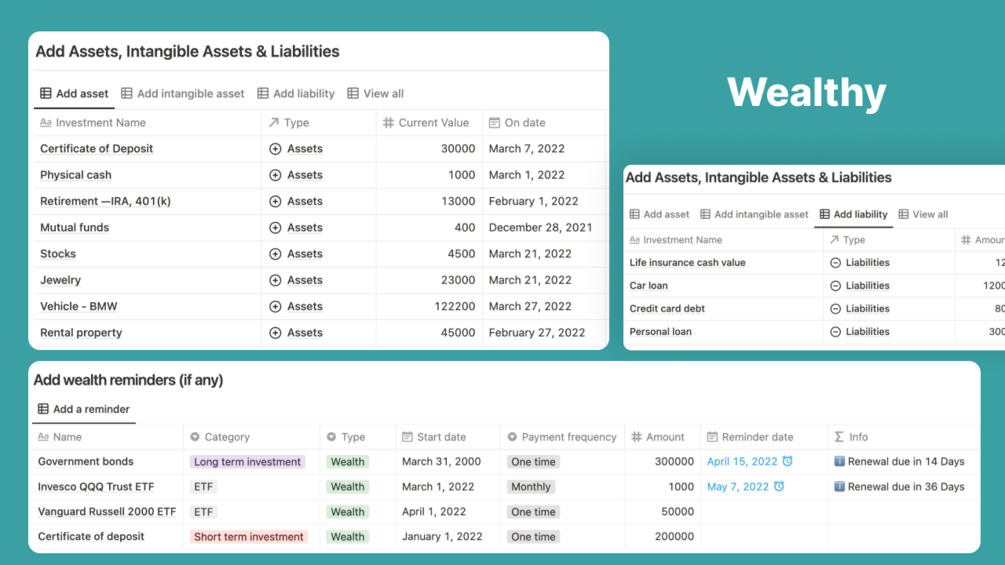 Healthy, Wealthy & Wise Notion Dashboard - A single place to track your health, wealth and wisdom on Notion. Fully customisable to your preferences and easy to use on both web and mobile. (Images shared above)